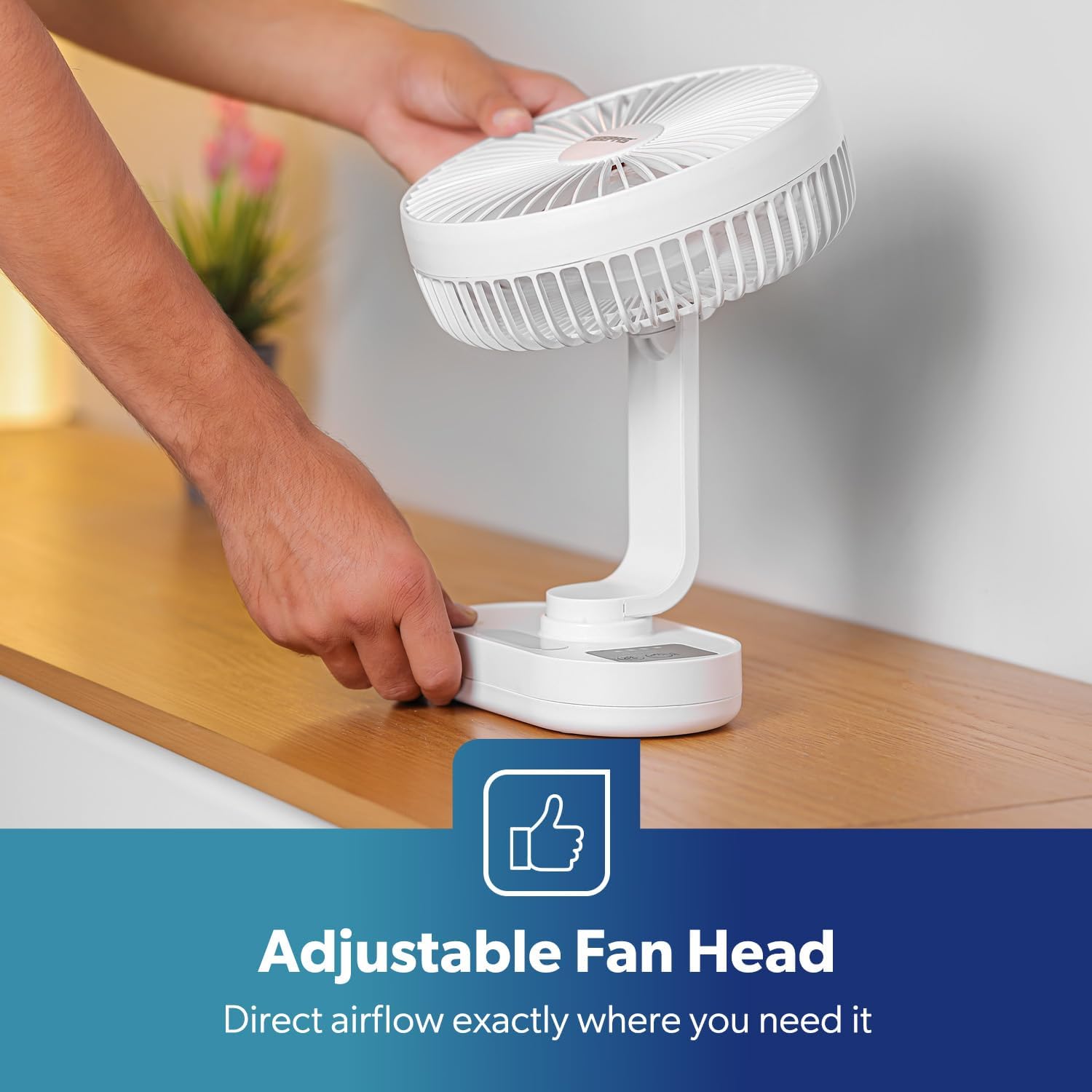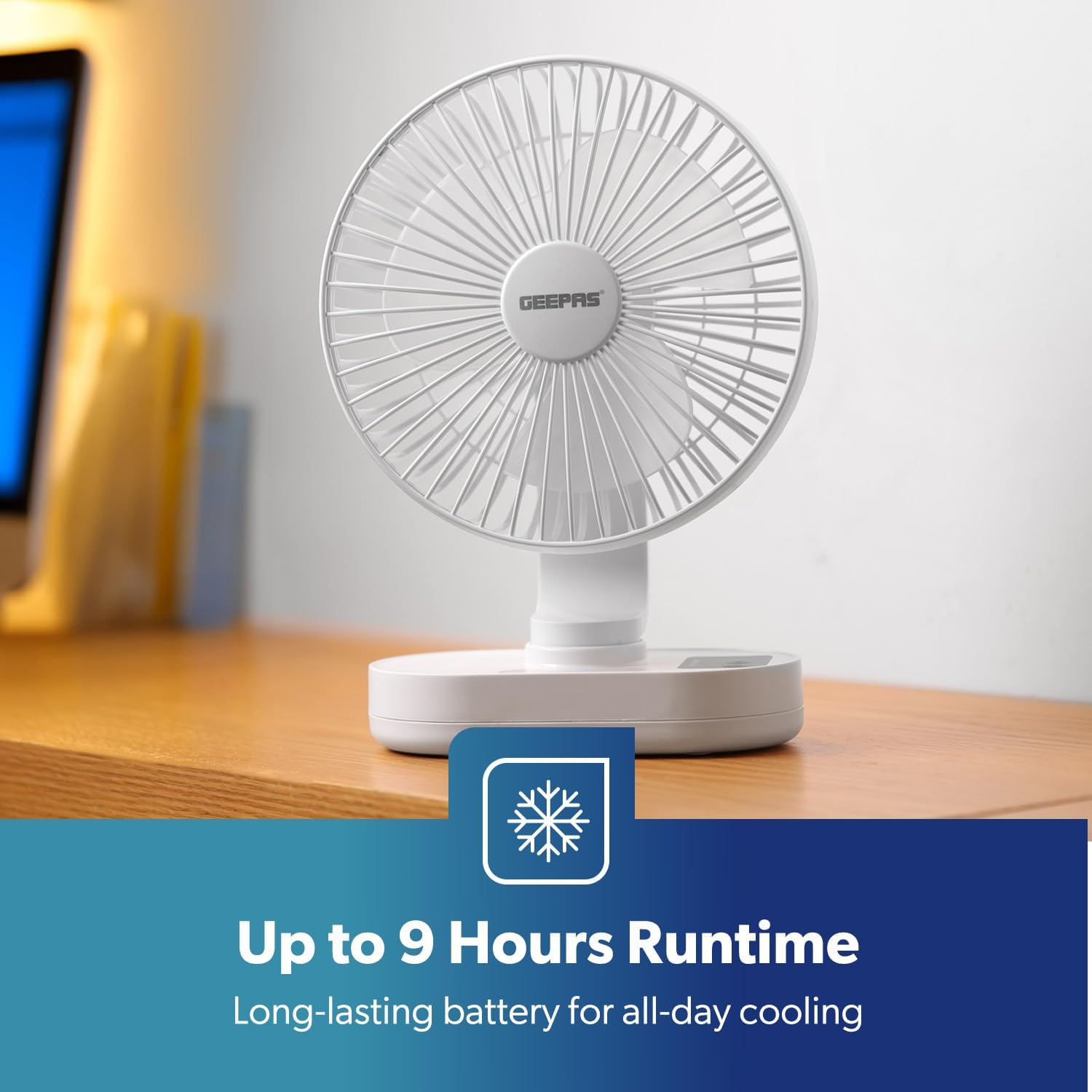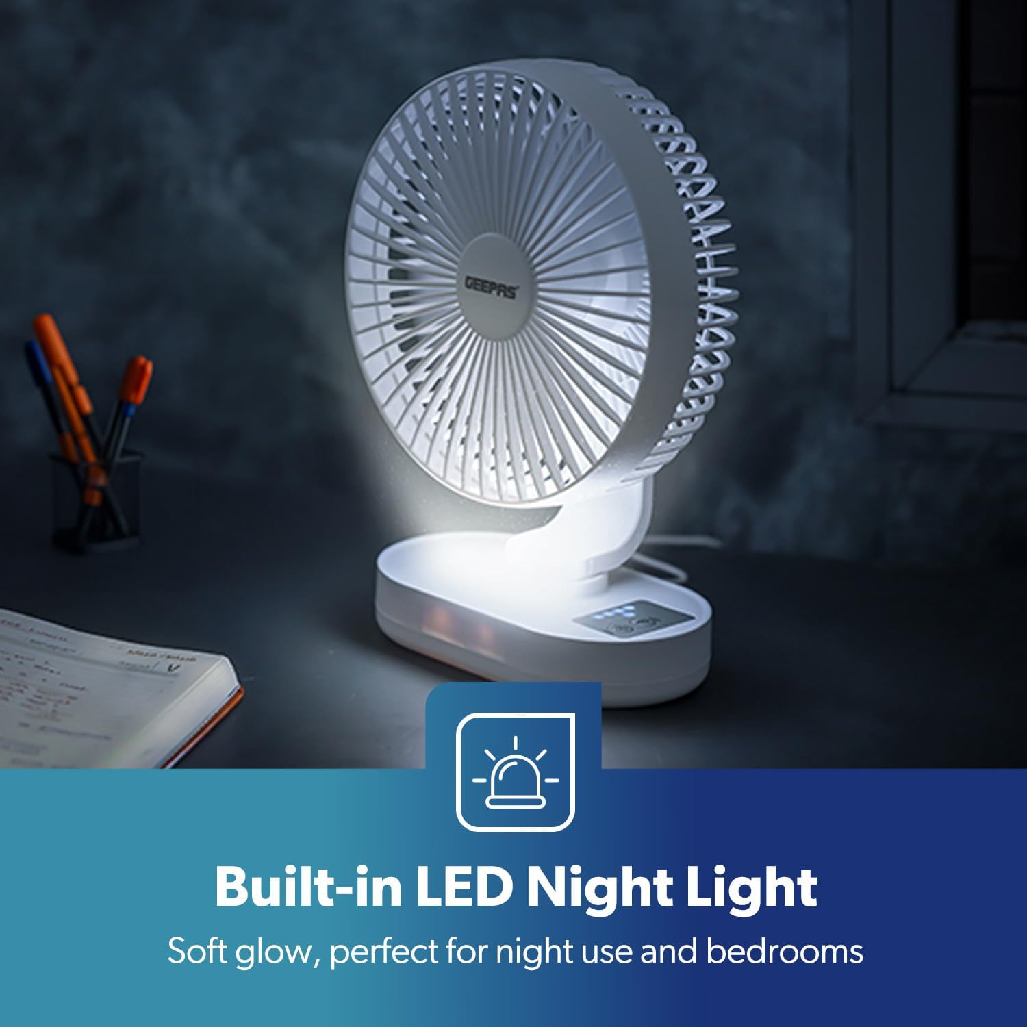 این پنکه دارای **چراغ LED کممصرف** است که نور مناسبی برای محیطهای کمنور فراهم میکند و تا **۱۸ ساعت** پس از هر بار شارژ روشن میماند. این ویژگی آن را به گزینهای عالی برای استفاده در شب یا محیطهای اداری تبدیل کرده است.