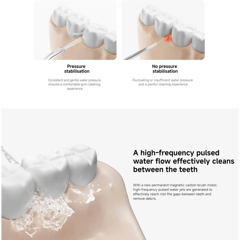 - تمیزکاری عمیق و موثر: جتهای آب با فشار 140PSI و فرکانس 1400 بار در دقیقه، پلاک و باقیماندههای غذا را از فضای بین دندانها پاک میکنند.