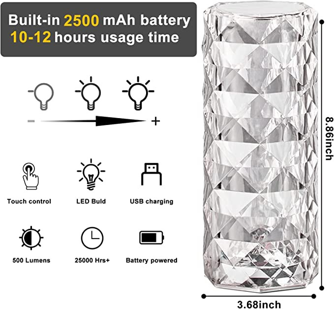 چراغ رومیزی کریستال، شارژی است و به راحتی شارژ میشود و طول عمر شارژ مناسبی هم دارد. این چراغ مدرن رومیزی، بوسیله درگاه USB به مدت ۱-۳ ساعت شارژ میشود و میزان شارژدهی آن هم بستگی به نوع نورپردازی و انتخاب نور شما دارد که بین ۱۰ تا ۱۲ ساعت دوام دارد.