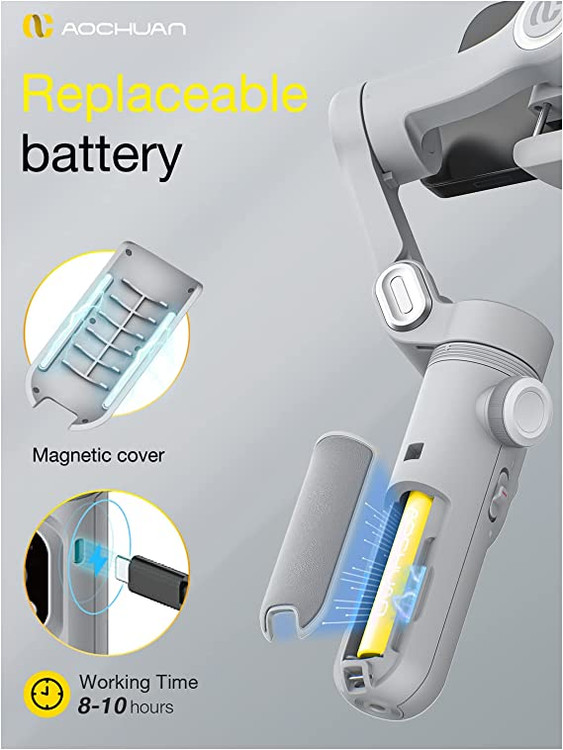 طراحی تاشو، سبک و کوچک گیمبال دستی سهمحوره AOCHUAN مدل Smart X Pro، به راحتی میتوانید همراه خود داشته باشید و در کولهپشتی و یا حتی در جیب شما جا میشود. در این مدل گیمبال، ماژول شارژ بیسیم در گیره موبایل تعبیه شده است و شما میتوانید با یک لمس دکمه، آن را فعال کنید تا تلفن همراه شما همزمان با عکاسی و فیلمبرداری، شارژ شود. طراحی اینگونه شارژ بی سیم، به شما کمک کیکند که دیگر دردسر کابل شارژ را نداشته باشید که مانع فعالیتهای شما بشود.