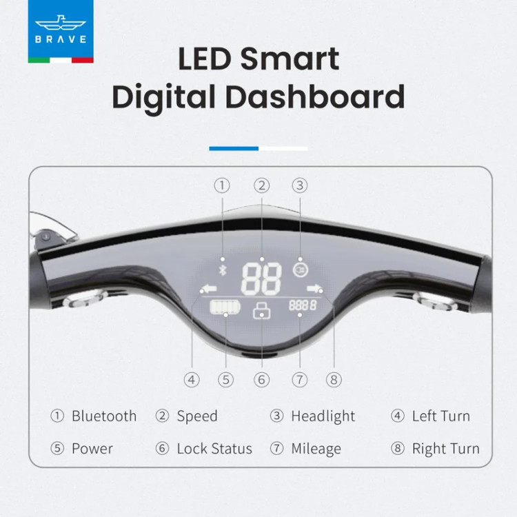 عملکرد بسیار بالا با راحتی آرامشبخش برای حرکت با سهولت و پایداری در ترافیک شهری، به لطف پشتیبانی از چرخهای 2 اینچی و حالت رانندگی (25 کیلومتر در ساعت) با یک بار شارژ • ایمنی: ترمز جلو فیزیکی و ترمز عقب EABS که رانندگی را به خصوص در طول شب ایمنتر میکند، چرخیدن به چپ یا راست بسیار آسان است در روزهای مهآلود/بارانی • فناوری NFC: به لطف استفاده از فناوری NFC صفحه نمایش و اسکوتر الکترونیکی را فقط می توان با استفاده از یک برچسب روشن کرد: فقط آن را به نمایشگر نزدیک کنید و چند ثانیه صبر کنید تا کلمه "pass" ظاهر شود. امکان استفاده از وسیله نقلیه فقط به مالکی که تراشه را در اختیار دارد • داشبورد دیجیتال هوشمند LED: اسکوتر الکترونیکی BRAVE BES-PRO دارای داشبورد دیجیتال هوشمند LED ارگونومیک است که نشان دهنده بلوتوث، سرعت، چراغ جلو، گردش به چپ، قدرت، وضعیت قفل، مسافت پیموده شده، گردش به راست. • روشن کردن در حال حرکت: باتری 12 Ah را بدون نگرانی در مورد باتری روشن کنید، یک نشانگر در صفحه نمایش LED زمانی که باتری تمام می شود به شما هشدار می دهد.